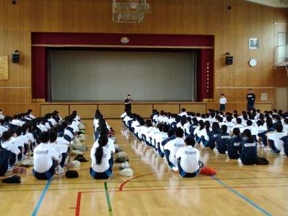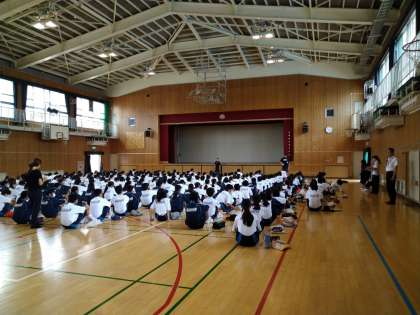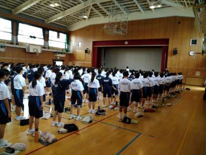 本日は1年生定例の学年集会が行なわれました。代表生徒が司会進行を努め、1年生の成長が感じられました。