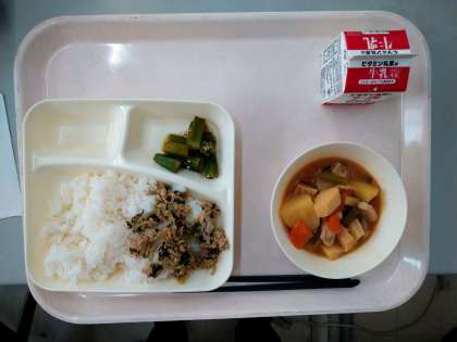 本日の給食のメニューは、鶏肉と野菜のみそ煮、オクラの梅風味、ツナっ葉いため、ごはん、牛乳でした。