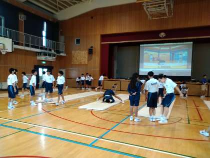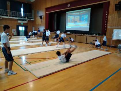 教員研修は3教科行われました。2年生男子の保健体育の授業が体育館で行われました。マット運動でした。ICTを使い、自身のパフォーマンスを確認し、技術向上に努めました。互いにコミュニケーションを取りながら、授業に参加している風景も見られました。2年1・2組のみなさん、よく頑張ていましたね!
