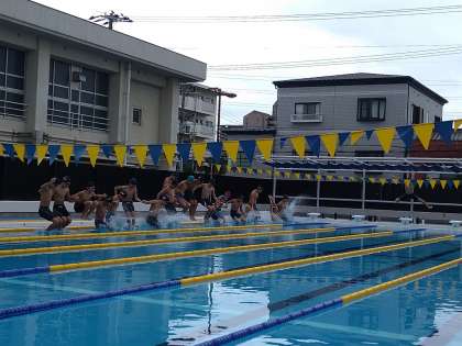 今日の17時、顧問の先生の合図で、一斉に手をつなぎ飛び込みました。とても微笑ましいい光景に拍手が湧きました!長い期間、我慢してくれました。ありがとうございます。思う存分、泳いでください!練習後のミーテイングの様子です。