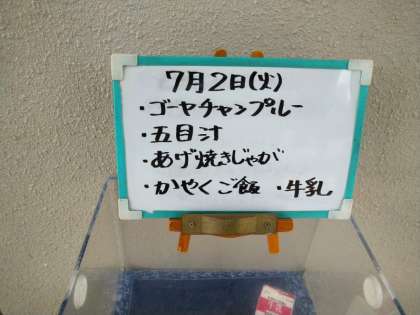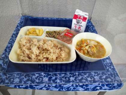 本日の給食のメニューは、ゴーヤチャンプルー、五目汁、あげ焼きじゃが、かやくご飯、ごはん、牛乳でした。