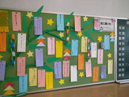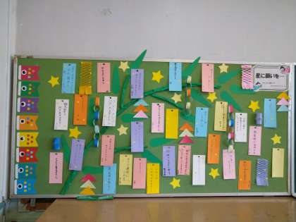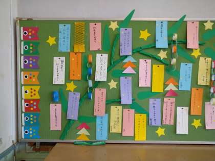 もうすぐ七夕ですね。星に願いを込め、お願い事を短冊に…。色鮮やかでとてもきれいです。みなさんの願いが叶うといいですね。
