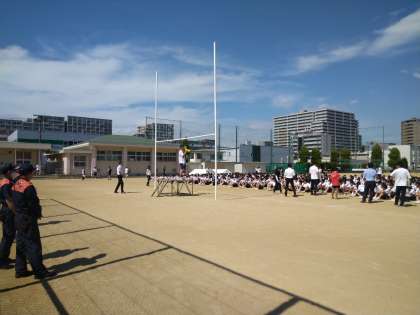 本日の6限目、火災を想定した避難訓練を行いました。城東消防署の方々にご来校いただき、講評をいただきました?5分30秒で避難完了しました。