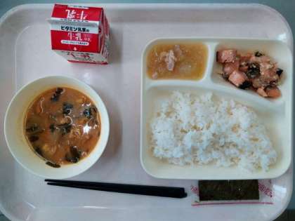 本日の給食のメニューは、さけのしょうゆ風味焼き、みそ汁、とうがんの煮もの、焼きのり、ごはん、牛乳でした。