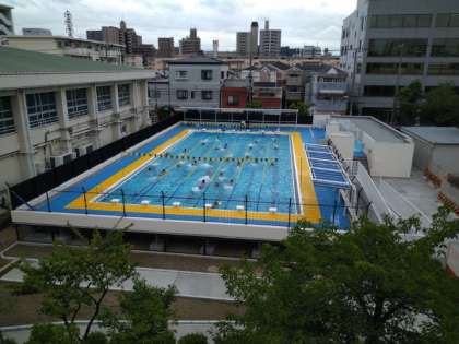新しいプールでは、水泳部が練習に一所懸命に取り組んでいました。
