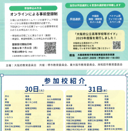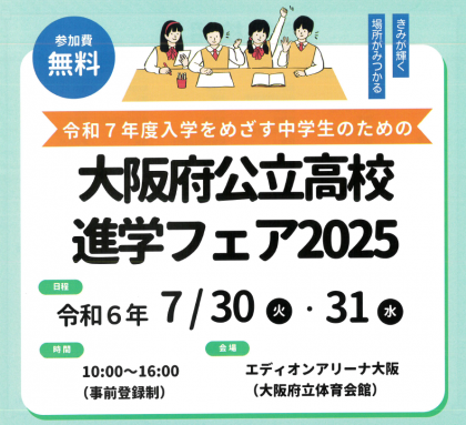 大阪府公立高校進学フェア2025は、7/30(火)・7/31(水) 10:00〜16:00(事前登録制) 会場はエディオンアリーナ大阪(大阪府立体育会館)