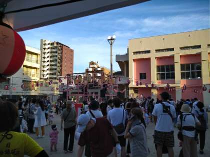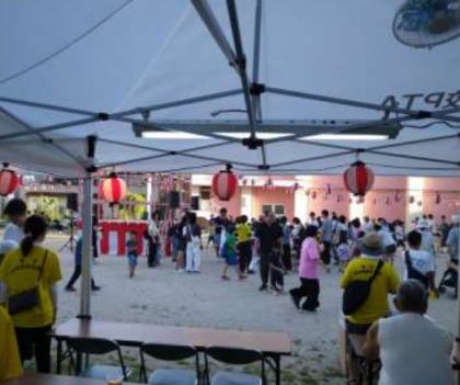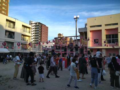 関目小学校内でも夏祭りが開催されています。やぐらを組み、盆踊りが行われていました。みんな楽しく時を過ごしております!
