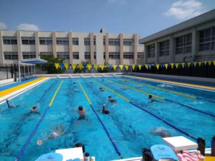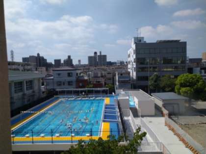 プールでは水泳部が今日も熱心に練習を行っています。たくさんの指導者に見守られながらの練習でした。大会に向けて、がんばってください。