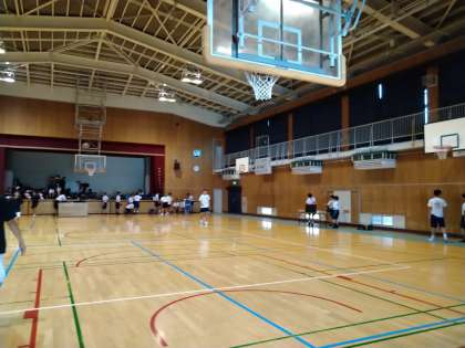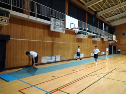 午後から体育館では、男子バスケットボール部が練習試合を行います。準備の様子です。