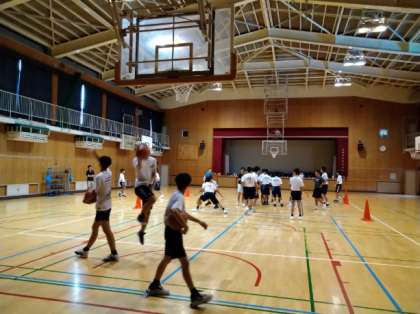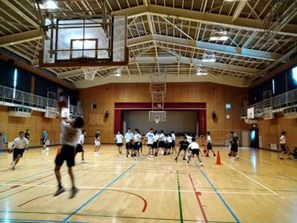 体育館では、バスケットボール部が練習に取り組んでいました。顧問の先生自ら、見本を見せていました。技術向上に向け、しっかりと話を聞き、練習に打ち込んでいました。