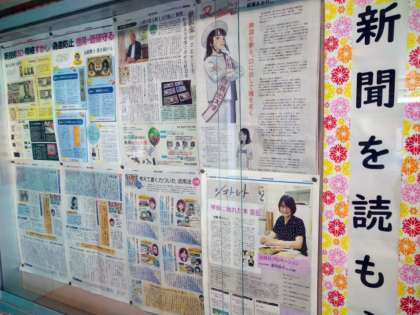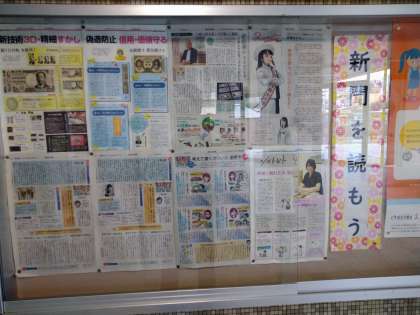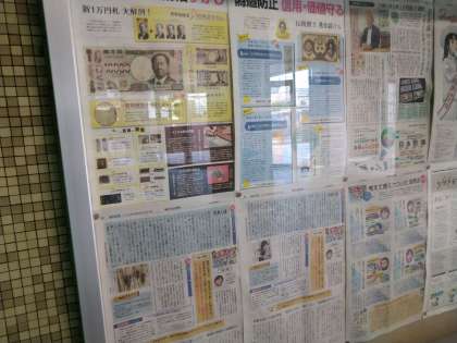 玄関ホールの掲示板に、図書室からの情報を盛り沢山掲載していただいています。今回は、新聞を読もうのコーナーに、新紙幣、天声人語等の記事がございます。足を止めて、ご一読ください。