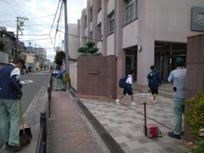 今日の登校にあわせ、管理作業員の方々が門付近を綺麗にしてくださいました。いつもありがとうございます。