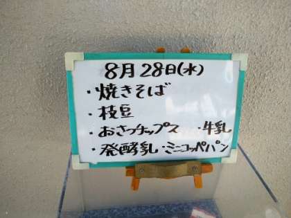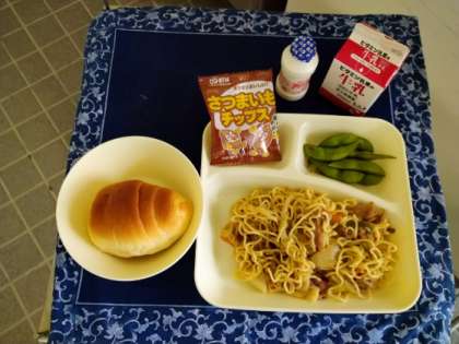 本日の給食のメニューは、やきそば、おさつチップス、発酵乳、ミニコッペパン、牛乳でした。