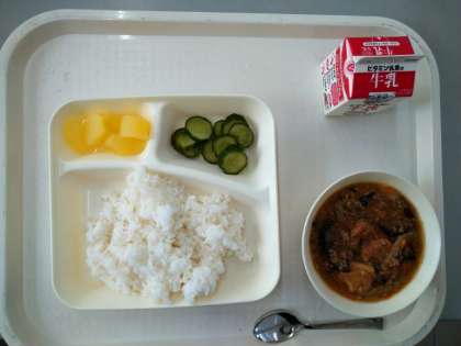 本日の給食のメニューは、まーぼーあつあげ丼、あっさりきゅうり、りんご(カット缶)、ごはん、牛乳でした。