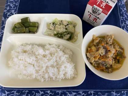 本日の給食のメニューは、他人丼、ささみと野菜のいためもの、オクラの甘酢あえ、牛乳でした。