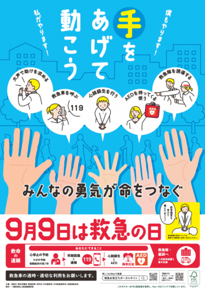 今日9(キュー)月9(キュー)日は「救急の日」です。「救急医療及び救急業務に対する国民の正しい理解と認識を深め、救急医療関係者の意識の高揚を図ることを目的とした日」です。