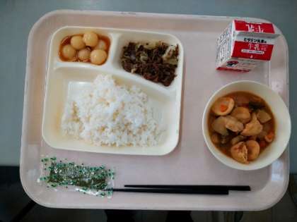 本日の給食のメニューは、一口がんもとさといものみそ煮、牛肉と野菜のいためもの、みたらしだんご、焼きのり、ごはん、牛乳でした。