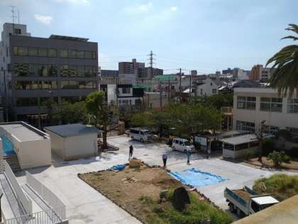 3階のフロアーからは、プールの授業の様子が見られました。中庭もかなり整備されています。この週末、まだまだきれいに整備されると聞いております。とても楽しみです!