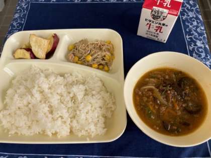 ☆給食室からこんにちは☆9月13日〜マーボーなす、ツナと野菜のいためもの、焼きさつまいもの甘みつかけ、ご飯、牛乳〜