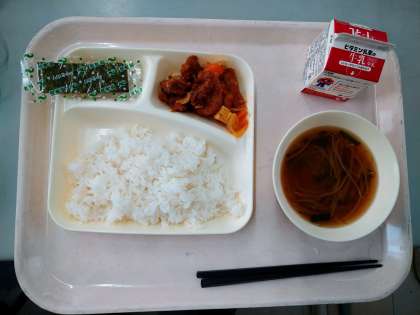 本日の給食のメニューは、酢豚、中華みそスープ、焼きのり、ごはん、牛乳でした。