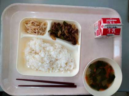 本日の給食のメニューは、プルコギ、トック、もやしのナムル、ごはん、牛乳でした。