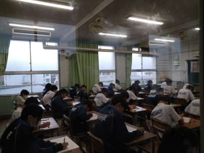 英語、国語、技術・家庭(1・2年生)、英語、国語、技術・家庭(3年生)でした。今、定期テストが終了しました。写真は、1限目の様子です。みなさん、問題にしっかりと向き合い、取り組んでいます。がんばっています!