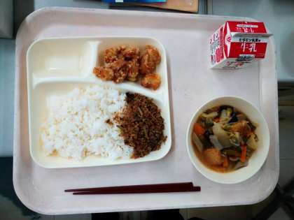 本日の給食のメニューは、鶏肉のたつたあげ、あつあげと野菜の煮もの、おかかなっ葉、ごはん、牛乳でした。