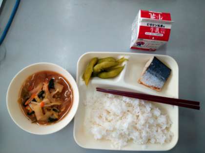 本日の給食のメニューは、さごしの塩こうじ焼き、みそ汁、枝豆、ごはん、牛乳でした。