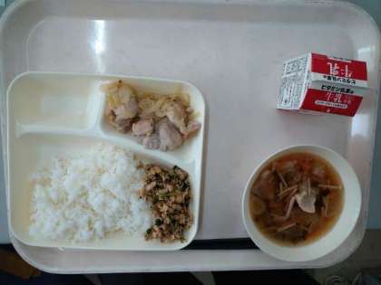本日の給食のメニューは、鶏肉のゆず塩焼き、ソーキ汁、ツナ大豆そぼろ、ごはん、牛乳でした。