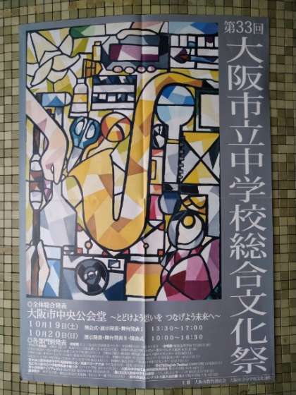 本日、明日と大阪市中学校総合文化祭が中之島中央公会堂で開催されます。届けよう想いを 繋げよう未来へ をテーマに、教科や部活動で創られた、たくさんの作品が展示されています。あわせて、部活動等の発表も行われます。素晴らしい作品に触れていただきますと幸いです。