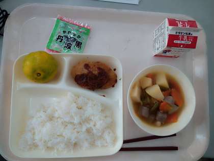 本日の給食のメニューは、みそカツ、じゃがいもと野菜の煮もの、みかん、そふと黒豆、ごはん、牛乳でした。