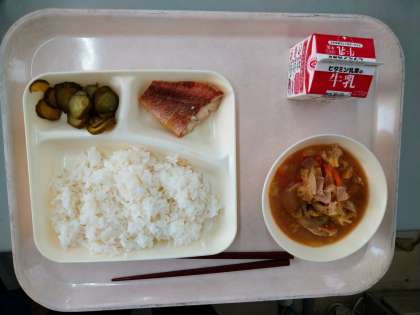 本日の給食のメニューは、赤魚のしょうゆだれかけ、豚汁、きゅうりのゆず風味、ごはん、牛乳でした。