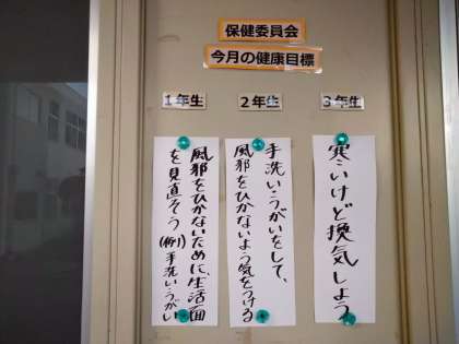 昨日、生徒専門委員会が実施されました。保健委員のみなさんは、今月の目標を考え、掲示物を作成してくれました。ありがとうございます。保健室前に掲示しています。