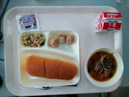 本日の給食のメニューは、焼きシューマイ、中華みそスープ、ツナと野菜のオイスターソースいため、コッペパン、いちごジャム、牛乳でした。
