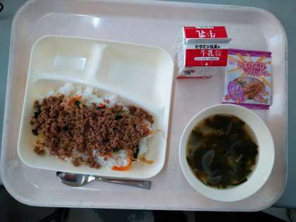 本日の給食のメニューは、ビビンバ、わかめスープ、いもけんぴフイッシュ、ごはん、牛乳でした。