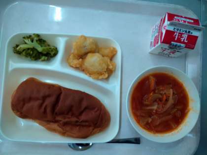 本日の給食のメニューは、白身魚フリッター、ミネストローネ、ブロッコリーのサラダ、、黒糖パン、牛乳でした。