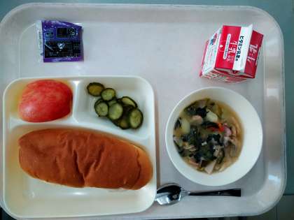 本日の給食のメニューは、鶏肉ときのこのシチュー、きゅりのピクルス、りんご、コッペパン、ブルーベリージャム、牛乳でした。