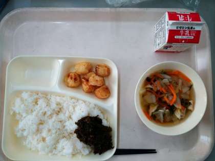 本日の給食のメニューは、いかのてんぷら、五目汁、のりのつくだ煮、ごはん、牛乳でした。
