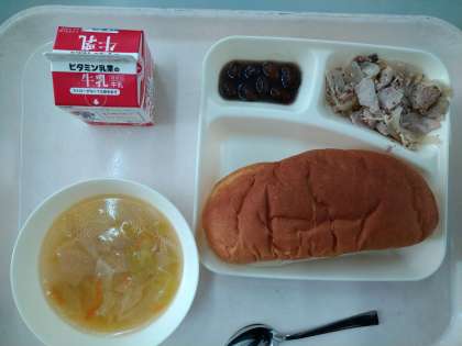 本日の給食のメニューは、豚肉のバジル焼き、スープ、うずら豆のグラッセ、黒糖パン、牛乳でした。