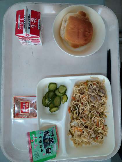 本日の給食のメニューは、和風焼きそば、きゅうりのしょうがづけ、ソフト黒豆、ミニコッペパン、牛乳でした。