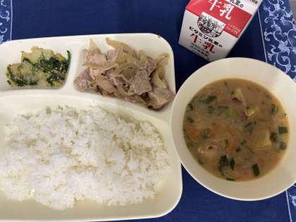 本日の給食のメニューは、豚肉のしょうが焼き、さつまいものみそ汁、きくなとはくさいのごまあえ、ごはん、、牛乳でした。