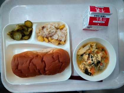 本日の給食のメニューは、中華おこわ、卵スープ、きゅうりのピリ辛あえ、黒糖パン、牛乳でした。