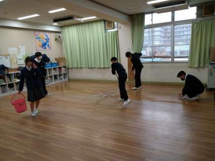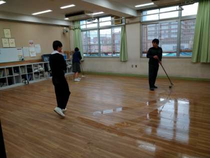 3年生は、ワックスがけをしました。班のみんなと丁寧にワックスがけをしてくれています。先生も手伝ってくれています。