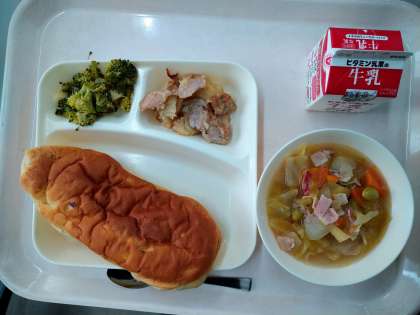 本日の給食のメニューは、鶏肉とじゃがいものガーリック焼き、スープ煮、ブロッコリーのサラダ、おさつパン、牛乳でした。