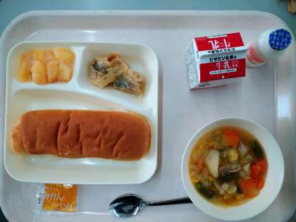 本日の給食のメニューは、あじのレモンマリネ、でぼ豆のスープ煮、白桃(カット缶)、発酵乳、コッペパン、みかんジャム、牛乳でした。