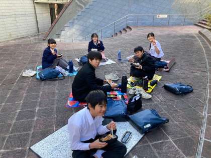 晴天の下、楽しくお弁当を食べています。
