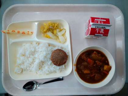 本日の給食のメニューは、豚肉と金時豆のカレーライス、焼きミニハンバーグ、はくさいのピクルス、棒チーズ、牛乳でした。