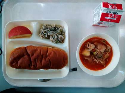 本日の給食のメニューは、ケチャップ煮、ささみと野菜のソテー、りんご、黒糖パン、牛乳でした。