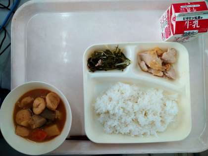 本日の給食のメニューは、鶏肉のおろしじょうゆかけ、一口がんもとじゃがいものみそ煮、水菜の煮びたし、ごはん、牛乳でした。