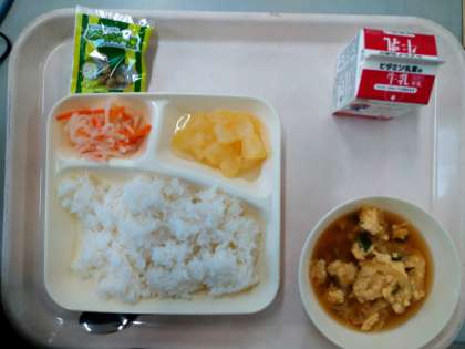 本日の給食のメニューは、親子丼、紅白なます、まっ茶大豆、洋なし(カット缶)、牛乳でした。